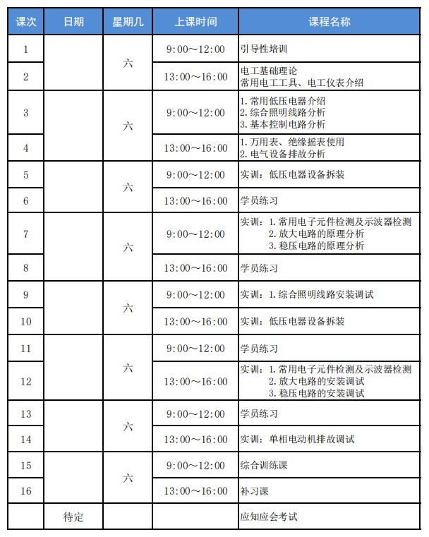 培训内容:维修电工入门、低压电器的选择和维护及电动机的基本控制电路、常用电工仪表介绍、电路的基础知识及实践课题原理的初步认识。